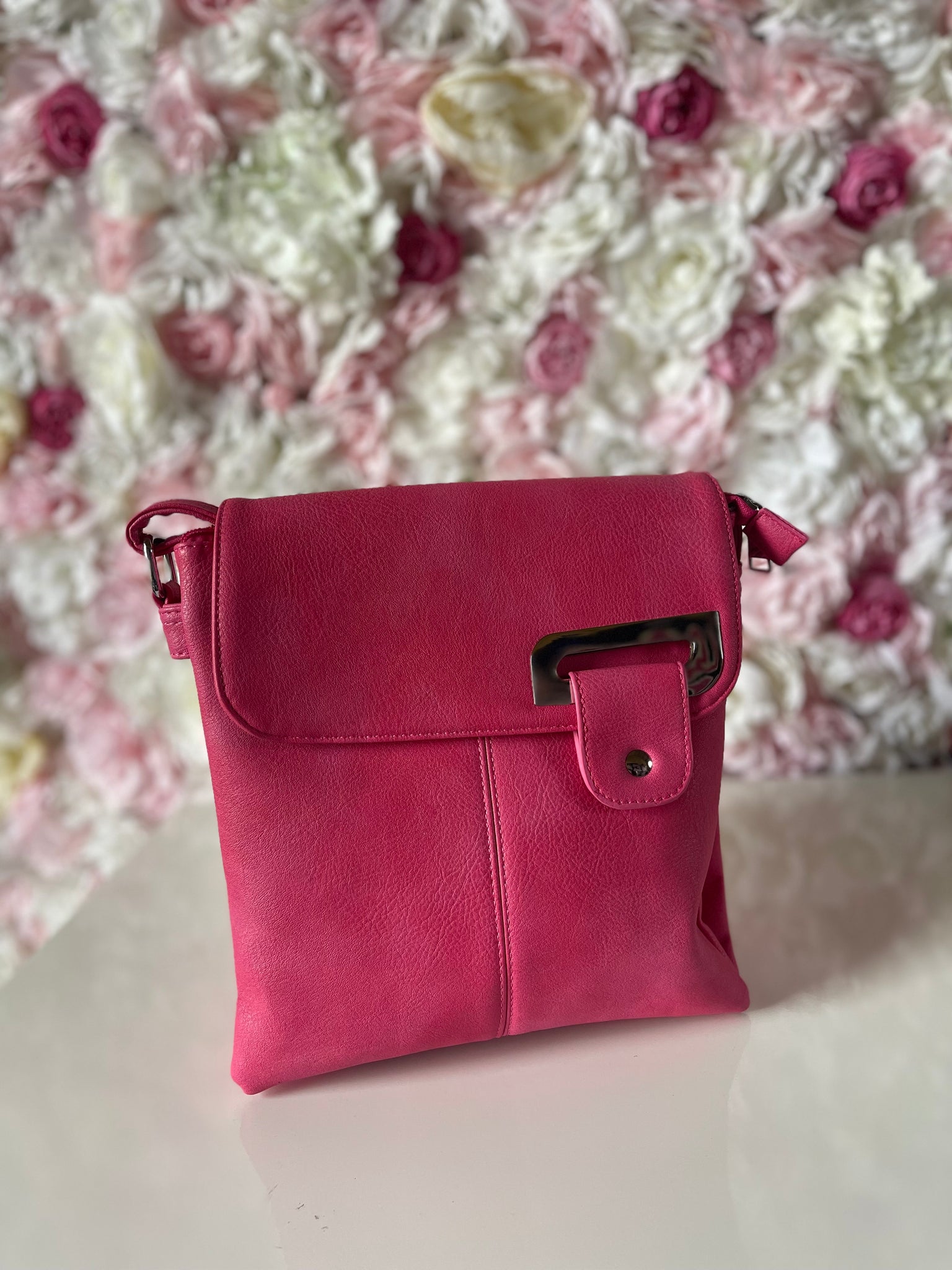 Double compartment flap over crossbody bag, features zip closure and flap over with magnetic fastening.